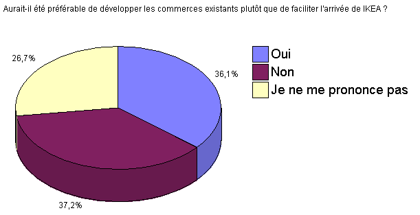 A la question de notre questionnaire « pensez-vous qu’il aurait été préférable de développer les commerces existants plutôt que de favoriser l’arrivée d’IKEA ? » (cf. graphique 13), les avis sont partagés : 36% ont répondu par l’affirmative, alors que 37% ont répondu par la négative.
