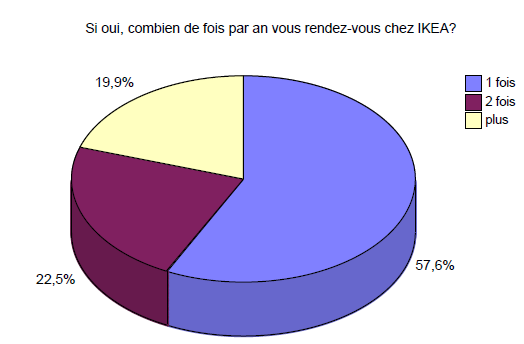 Par ailleurs, IKEA Bayonne captera une part de la clientèle des magasins de l’enseigne de Bordeaux, Toulouse et Bilbao. En effet, 47% des habitants qui ont répondu au questionnaire disent être clients de l’un de ces magasins (cf. Tableau 5). Et parmi ces 191 personnes, certaines se rendent plus d’une fois par an chez IKEA, distant en moyenne de deux heures en voiture : 58% se déplacent une fois par an dans l’un des magasins de Bordeaux, Toulouse ou Bilbao; 23% font le déplacement de deux fois par an (cf. graphique 18).