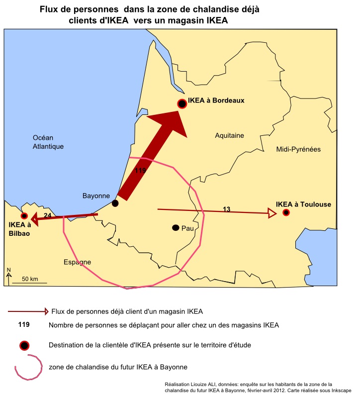 Ces flux vers les trois magasins cités sont représentés sur la carte suivante. Elle révèle que 119 personnes déjà clientes d’IKEA se rendent au magasin de Bordeaux; 24 se rendent à Bilbao et 13 à Toulouse. A noter qu’une même personne peut se rendre dans deux ou trois magasins.