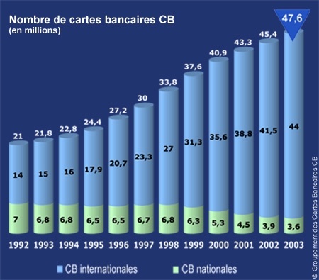 Le montant des paiements par carte bleue (paiement on et off-line) a dépassé les 200 milliards d’euros en 2003. Le nombre de cartes bancaires est également en constante progression, comme on peut le constater sur le schéma suivant42 :