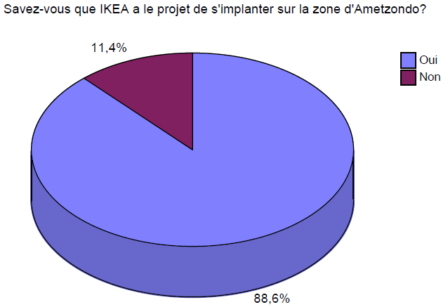 L’annonce du projet en 2006, ses étapes successives et les prises de position des acteurs locaux ont été relayés régulièrement dans les médias locaux. Il n’est pas étonnant donc de voir que 89% des personnes ayant répondu au questionnaire disent être informées de l’implantation d’IKEA à Ametzondo (cf. graphique 6). Mais il est important de noter aussi que nombre de ces habitants ignorent qu’un complexe commercial va accompagner le magasin IKEA. Et plusieurs d’entre eux se déclarent hostiles au Forum Commercial mais non au magasin IKEA.