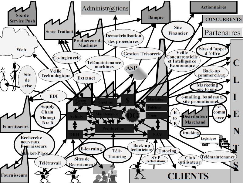 De plus, toutes les fonctions sont touchées : Internet offre des outils pour le marketing, la recherche d’appels d’offre, l’assistance aux commerciaux sur le terrain, la veille, les achats, la gestion des approvisionnements, le recrutement, la formation, la publicité, la vente, la logistique, le service après vente, gestion de la relation client, suivi de la qualité, la surveillance des risques, les relations financières avec les partenaires, l’information des actionnaires, la dématérialisation des relations avec l’administration, la gestion de projets etc.