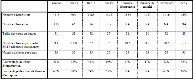 Si la durée moyenne des cours et des séances ne varie pas selon que l’on s’intéresse aux cours de finance d’entreprise ou de finance de marché, on constate que les cours de finance de marché sont en moyenne plus « rentables » en crédits ECTS (huit heures seulement pour un crédit) que les cours de finance d’entreprise.