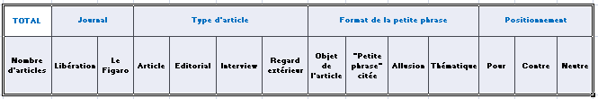 On le constate, ce tableau rassemble deux rubriques plutôt quantitatives : Journal et Type d’article même si la rubrique Journal n’est pas purement quantitative, et deux autres plutôt qualitatives : Format de la petite phrase et Positionnement.