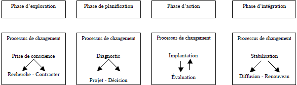Ainsi, l’implantation du changement se déroule en quatre phases à travers ce modèle.