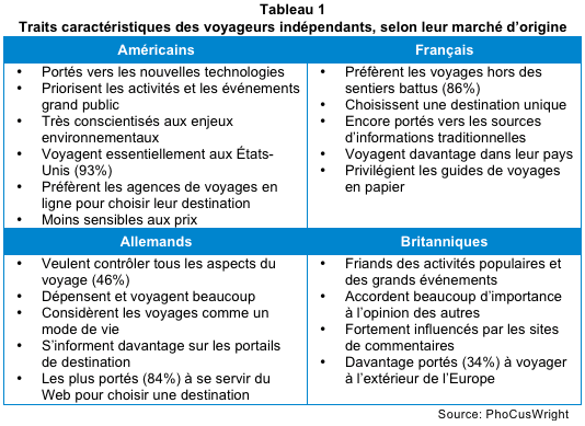 Tableau 1 : Traits caractéristiques des voyageurs indépendants – Source: PhoCusWright.