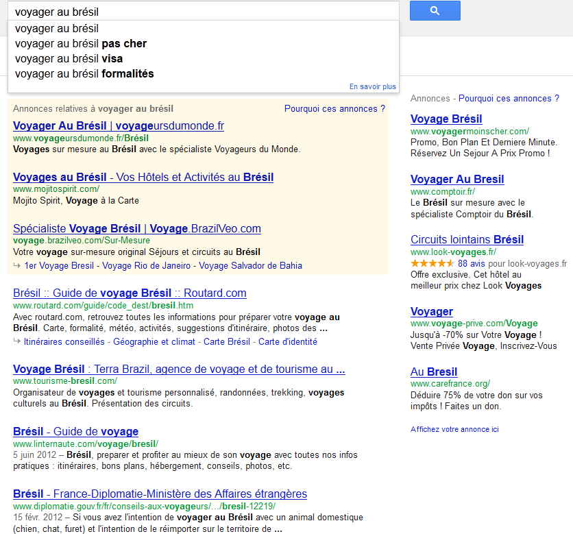 Si l’on tape sur le moteur de recherche le plus connu « voyager au Brésil», c’est-à-dire la recherche la plus basique qu’il soit, nous aurons déjà accès à des agences de voyages, des sites d’informations, des forums, (cf. Figure 1) :