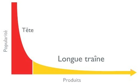 Avec le temps, dans un marché régi par le modèle de la longue traine, la traine (ici représentée en jaune), à tendance à s’allonger et à s’épaissir au détriment de la tête (ici montrée en rouge).