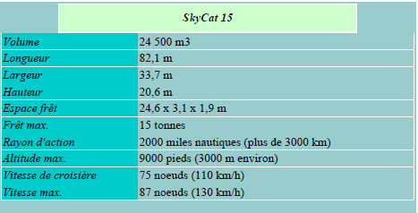 •  Le SkyCat 1000 pourrait transporter 880 Ford Mondeos ou des tonnes de fruits et légumes frais ou encore plus de 12 tanks selon l’utilisation que l’on désire en faire…