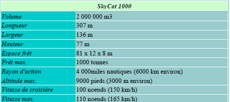 •  Le SkyCat 1000 aurait une capacité de fret équivalente à celle d’une dizaine de Boeing 747.