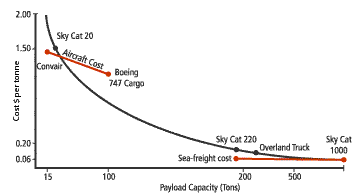 Le schéma ci-dessous montre bien que le coût de transport par tonne en SkyCat est bien inférieur à l’avion notamment en raison des gros volumes qu’il peut déplacer. En fonction du modèle de SkyCat, on peut constater que le coût peut être inférieur à la route, voir même inférieur au maritime.