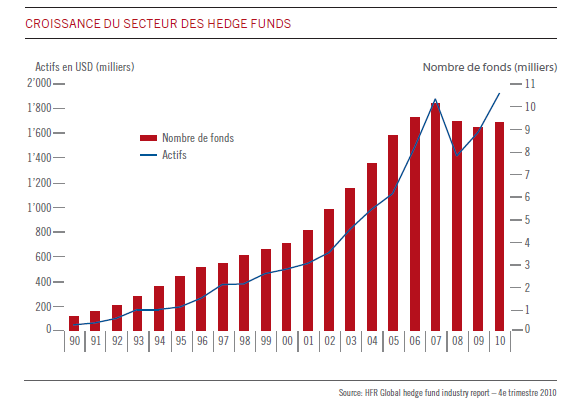 Le secteur des hedge funds est passé d’environ 80 milliards de dollars d’actifs sous gestion en 1990 à au moins 1800 milliards de dollars en 2010.