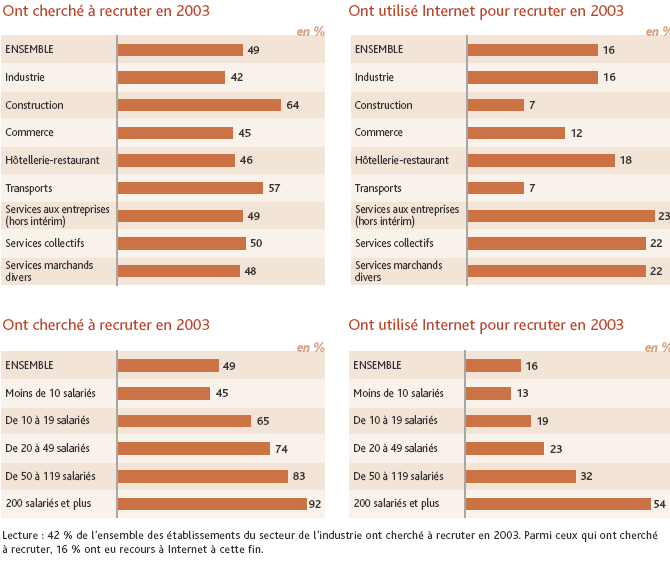 Tableau 1 : Proportions d’établissements ayant cherché à recruter et parmi ceux-ci, d’établissements ayant utilisé Internet (à la fin 2003)
