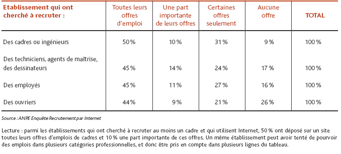 Par ailleurs, les employeurs ayant cherché à recruter des cadres (et qui ont tenté de recruter en ligne, quelle que soit la catégorie visée) sont très peu nombreux (9 %) à n’avoir déposé aucune offre de cadre sur un site, alors que 26 % de ceux qui ont cherché à recruter des ouvriers se sont abstenus d’utiliser Internet à cette fin.