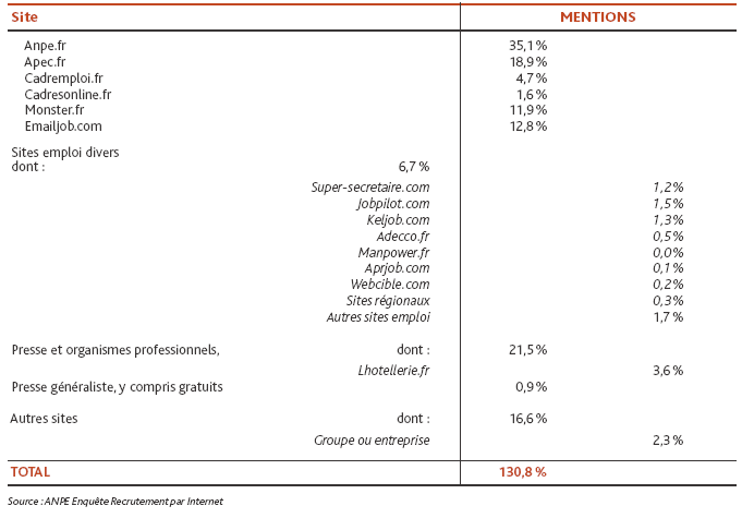 Une enquête OFER21 conçue en 2005 pour répertorier les différents usages d’Internet dans le processus de recrutement, confirme que l’utilisation d’Internet dans ce domaine concerne d’abord la réception de candidatures spontanées (23.4% des établissements en ont réceptionné sur Internet), puis la diffusion d’annonces sur des sites corporate ou un site emploi (16.8%) et enfin la consultation de candidathèques (6.8%).