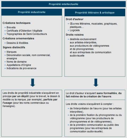 Selon l’OMPI, il existe deux sortes de propriétés intellectuelles : la propriété industrielle et le copyright ou droit d’auteur. La propriété intellectuelle réfère de manière générale à la création de l’esprit humain.