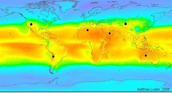 Carte du rayonnement solaire sur Terre : les couleurs chaudes signalent une forte intensité lumineuse :