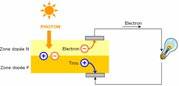 En captant l’énergie des photons, les électrons de la couche de silicium N sont excités et créent une différence de potentiel avec la couche P chargée positivement. Ceci engendre une circulation d’électrons et donc un courant électrique. L’énergie photovoltaïque résulte de la conversion de la lumière solaire en énergie électrique. La puissance délivrée varie alors en fonction de la technologie des panneaux, de l’intensité lumineuse, et donc de la latitude, de l’heure de la journée, de la période de l’année et de la couverture nuageuse.