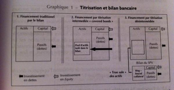Le mécanisme utilisé dans le modèle classique de la banque (intermédié) réside dans le fait que les banques transforment les risques sur un seul bilan. A l’inverse, le mécanisme utilisé par la titrisation (désintermédiée) permet d’effectuer un transfert de risque de la banque vers un véhicule externe suivant un processus de transformation en plusieurs étapes le long d’une chaîne de bilans et de diverses sources de capitaux . La titrisation désintermédiée fait appel à diverses sources de capitaux et de garanties.