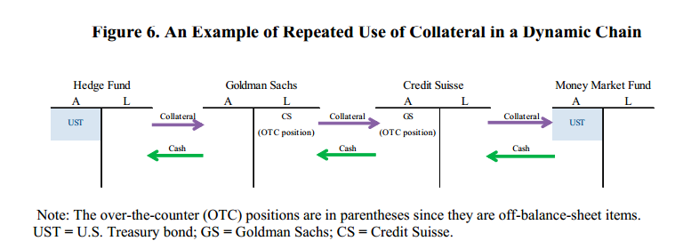Un autre mécanisme clé du Shadow Banking s’appuie sur des transactions collatéralisées. Il s’agit de la réutilisation d’un volume de transactions financières aussi grand que possible.