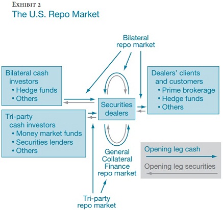 La même garantie peut ensuite être utilisée par Goldman Sachs comme marge pour le Credit Suisse. Credit Suisse peut alors passer l’obligation à un money market funds jusqu’à l’échéance. Notez que dans cet exemple la même obligation du Trésor a été utilisée trois fois en tant que garantie , par le propriétaire d’origine, des hedge funds aux money market funds. Le repo est donc un moyen de prêter du cash sans altérer son profil de liquidité .