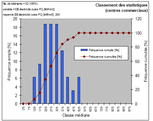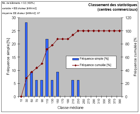 Ci-contre, le graphique des relevés des puissances de chaleur relevées dans les centres commerciaux. Elle fait état de valeur oscillant de 20 à 230 kWh/m²/an, avec une moyenne au alentour des 97 kWh/m².