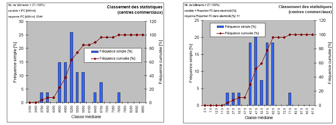 Elles font état de 100 à 800 kWh/m²/an avec une moyenne de 547 kWh/m²/an (graphique de gauche), et sans intégrer les consommations de froid commercial, on a des consommations qui varient de 100 à 550 kWh/m²/an avec en moyenne 298kWh/m²/an.