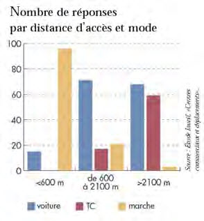 La moitié des centres commerciaux sont accessibles par une voie rapide. 40% sont accessibles par les transports en commun ou par des aménagements cyclables. Le graphique ci-contre montre qu’en fonction de la distance qui sépare le centre commercial et le domicile, le moyen de déplacement est différent.