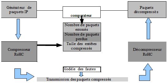 Le modèle d’évaluation de performance se compose des blocs principaux suivants: générateur des paquets IP, compresseur/décompresseur RoHC, comparateur et modèle de fautes. Nous utilisons « VLC player » pour générer des paquets multimédia en flux selon le protocole RTP. Ensuite, nous les passons au compresseur RoHC. Des fautes sont ajoutées aux paquets compressés afin de simuler des fautes dans le lien radio. La simulation donne un rapport statistique sur le nombre de paquets erronés, sur le nombre de paquets perdus, et sur la taille d’entêtes compressés.