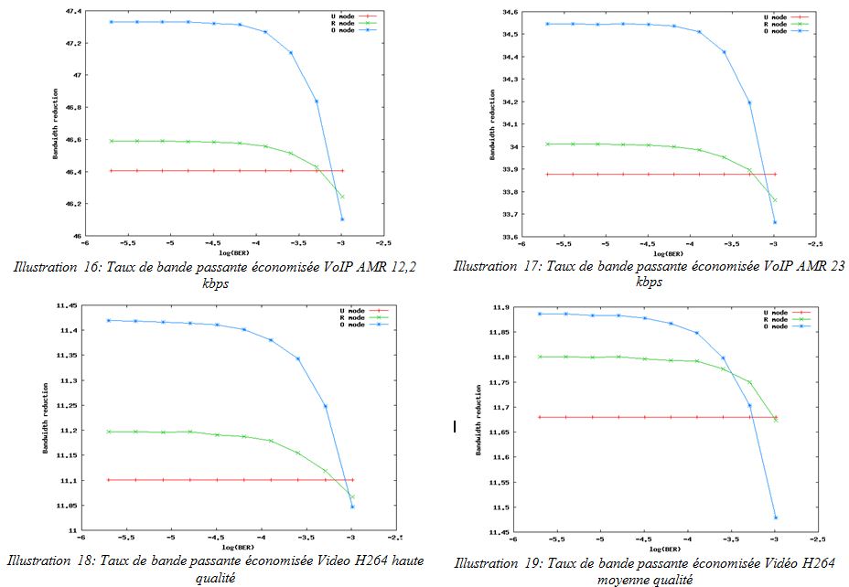 Les résultats dans le figure 15 ne prends pas en compte des erreurs dans le lien radio qui causent désynchronisation entre le compresseur et le décompresseur. Dans les figures 16 à 19, nous évaluons l’efficacité de RoHC avec les taux de bits erronés différents (BER). On trouve que si le BER augmente, le taux de bande passante économisée diminue. Le niveau de diminution est moins de 1%. Le RoHC bidirectionnel (O-mode et R-mode) est plus efficace par rapport à RoHC unidirectionnel lors que le BER est moins de 103,5 . Si le taux d’erronés est petite, O-mode économise le plus de bande passante, mais quand le BER est supérieur à 103 , R-mode est le meilleur.