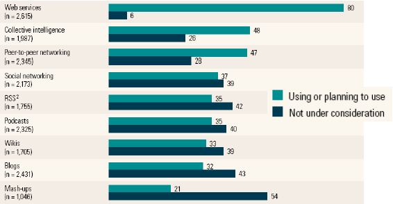 Au regard de ces chiffres, il semblerait que la tendance de l’utilisation des technologies Web 2.0 par les entreprises est loin d’être une simple bulle. Le graphique ci-dessous représente les neufs outils du Web 2.0 les plus utilisés par les entreprises. Nous pouvons constater que les services Web sortent largement du lot, avec une utilisation de 80%, suivis par l’intelligence collective (48%) à égalité avec les réseaux peer to peer :