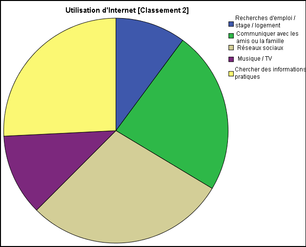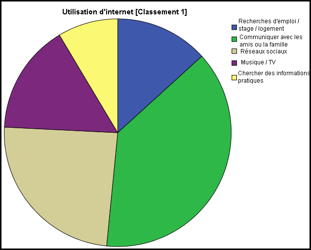 Les premiers usages qui ressortent de l’utilisation d’Internet, indépendamment du média de connexion, sont sans surprise les utilisations dites « ludiques », et notamment : la communication avec les amis et la famille (38,3%), et la participation à des réseaux sociaux (24,2%), talonnés par le téléchargement et le visionnage de films et de musique (15,6%) ; tandis que les utilisations qu’on pourrait dire « pratiques », soit les recherches d’emploi, de stage ou de logement ainsi que d’informations pratiques, totalisent quant à elles moins de 22% des suffrages.
