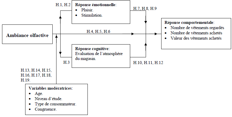 Pour comprendre l’influence de la diffusion d’odeur sur les réponses des consommateurs nous nous sommes basés sur le travail de Bitner (1992), Kotler (1973 – 1974) et Mehrabian et Russel (1973) pour définir le cadre conceptuel testé lors de notre étude.