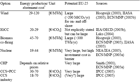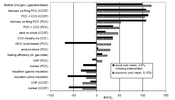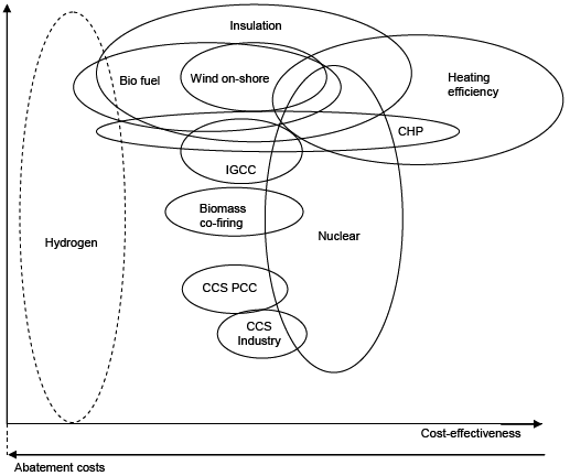 Dans leurs travaux, J.C. Jansen et S.J.A. Bakker de l’ECN (Energy research Center of the Netherlands) développent une analyse « coût-avantage social » de 10 mesures techniques de réduction des émissions de gaz à effet de serre. Ils cherchent à intégrer les externalités économiques et environnementales, ainsi que les impacts en termes de sécurité énergétique.