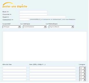 L’auteur doit également choisir la « thématique » et la « rubrique » permettant de définir le type d’information envoyée puis il doit remplir le champ « calendrier ». Il rédige ensuite le contenu de sa dépêche. Afin d’étayer et d’argumenter son contenu, l’auteur dispose de la possibilité de l’accompagner de plusieurs liens hypertextes (de un à cinq) vers des sources d’informations connexes.