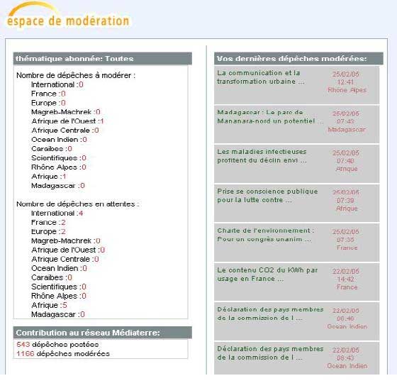 On constate que des dépêches sont en attente sur les portails : International, France, Europe et Afrique. S’affiche également un état des lieux de l’activité du modérateur. Ici, le modérateur a posté 543 dépêches et en a modéré 1156.