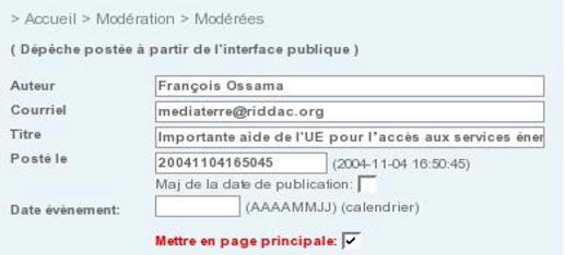 Le modérateur voit apparaître une liste des titres des dépêches accompagnés des noms des auteurs, des dates de soumission et du nom du portail de destination. Pour procéder à la modération, le modérateur sélectionne un titre de dépêche et obtient le contenu de cette dépêche dans un formulaire qu’il peut modifier s’il le souhaite.