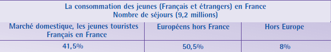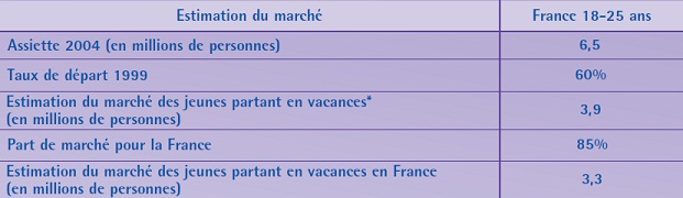 Le marché français du tourisme des jeunes regroupe un potentiel de partants de 23 millions de personnes (4 millions de jeunes français et 19 millions de jeunes européens). La France capte 85% de cette clientèle française et près de 25% de l’européenne, soit environ un tiers de ce segment de touristes4.