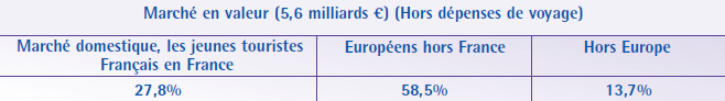 Au niveau de la composition du marché en valeur, les recettes totales générées par le tourisme des jeunes sont évaluées à 5,6 milliards d’euros en 2005 (hors dépenses de voyages), dont 27,8% (soit 1,6 milliard) imputables aux jeunes français, près de 58,5% (soit 3,2 milliards) aux jeunes européens et près de 13,7% (soit 0,8 milliard)6 aux jeunes internationaux.
