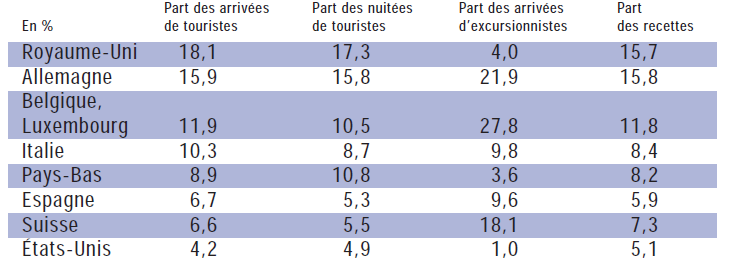 Au niveau des principaux marchés émetteurs de touristes en France, tous segments confondus, nous retrouvons en premier lieu le Royaume- Uni avec 18,1% des touristes, puis l’Allemagne avec 15,9% des touristes, ensuite la Belgique et le Luxembourg avec 11,9% des touristes et en quatrième position l’Italie avec 10,3 de touristes11.