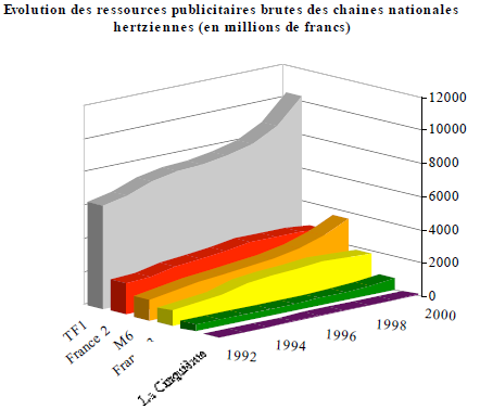 Il est de fait impossible de connaître précisément le montant des recettes publicitaires nettes. On sait que celles-ci ont considérablement augmenté durant ces quinze dernières années, la télévision étant devenue le support publicitaire privilégié des annonceurs1. D’après l’Institut de recherche et d’études publicitaires (IREP), on peut évaluer le montant des recettes publicitaires brutes à environ 3 milliards d’euros2.