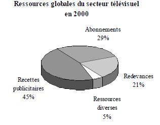 L’évaluation des ressources des chaînes. Les sociétés audiovisuelles diffuseurs de phonogrammes, et tout particulièrement les chaînes de télévision, interviennent dans un marché dont la principale caractéristique est l’importance des flux monétaires qui le régissent. Pour l’ensemble du secteur télévisuel, le financement global des chaînes s’élevait à près de 6,56 milliards d’euros en 2000. L’essentiel de ce financement provient de la publicité et, dans une moindre mesure des abonnements et de la redevance.