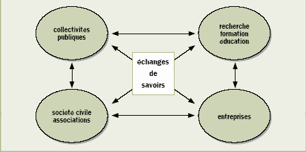 Pour entrer réellement en application, les savoirs pour le développement durable doivent être partagés par quatre communautés : la communauté de recherche et de formation, qui joue un rôle central mais pas unique, les entreprises, les collectivités publiques de tous niveaux depuis les organismes internationaux jusqu’aux collectivités locales et la société civile à travers les associations.