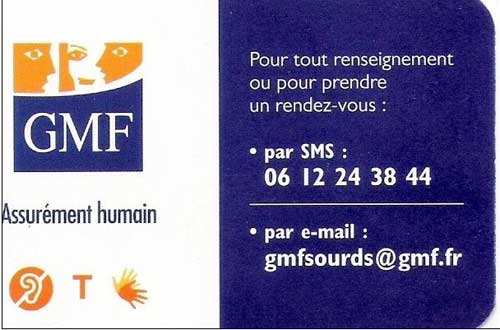 La carte de visite indique un numéro de téléphone mobile pour y adresser des messages écrits et une adresse mail (gmfsourds@gmf.fr) accompagnés de trois symboles : l’oreille barrée (symbole de la déficience auditive), le « T » (symbole de la présence d’une boucle magnétique) et des mains (symbole de la LSF).