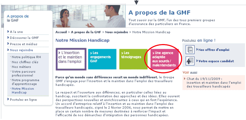 Le site Internet de la GMF diffuse l’information d’un tel accueil dans la sous-rubrique « Notre Mission Handicap » de la rubrique « Nous rejoindre » dans « l’espace emploi » de la partie « A propos de la GMF ».