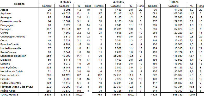 Le nombre de campings sur le territoire français s’élève à 7923 pour un total de 918 712 places disponibles (avec 1219 une étoile, 3568 deux étoiles, 2375 trois étoiles et 761 quatre étoiles74). Il s’agit du premier mode d’hébergement touristique marchand en France, et il se classe second parc au monde après les Etas Unis avec près de 6 millions de campeurs français,