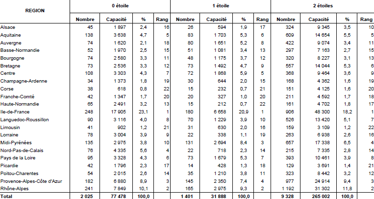La France compte 12 754 hôtels à bas coût (soit 2025 hôtels 0 étoile, 1401 une étoile et 9328 deux étoiles77) et regroupe une capacité hôtelière d’environ 375 000 places. Avec environ 20% des places hôtelières à bas coût, nous retrouvons encore une dominance majeure de la région Ile de France pour ce type de logements, suivie avec Cette région des régions Rhône- Alpes et PACA. Le nombre important des hôtels à bas coût dans la région Midi Pyrénées est à relever. En effet, cette dernière se classe troisième pour le nombre d’hôtels une étoile et quatrième pour les 2 étoiles.