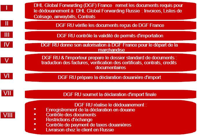 Afin de préparer un dossier impeccable pour la douane russe, DHL Global Forwarding a mis en place toute un schéma d‘échange (cf. ci-dessous) avec sa filial (concessionnaire en douane) situé en Russie. Pour les mêmes raisons les clients de DHL Global Forwarding sont des décisionnaires, c‘est à dire ils définissent eux-mêmes le moyen de transport et de conditionnement suivant les exigences de la législation russe pour le type de produit à exporter.