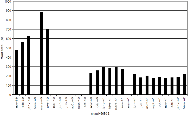 La figure III rend compte de ces montants mensuels et montre que la véritable diminution du nombre de bénéficiaires obtenant une aide pour le loyer se produit entre mars-avril 1940 et novembre 1940. Les données, incomplètes, ne permettent pas de déterminer si la rupture a été progressive ou abrupte. La diminution est probablement attribuable à une baisse de la demande, puisque aucune décision du conseil ne rend compte d’une volonté de réduction budgétaire dans ce secteur.