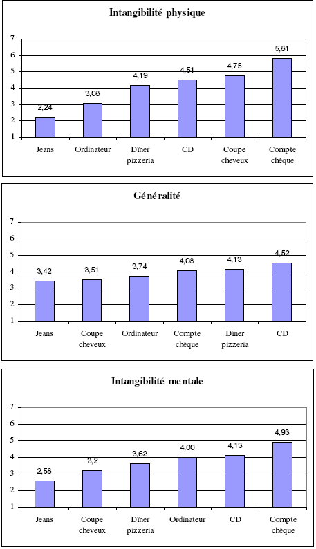 Laroche, Bergeron et Goutaland (2001) ont, nous l’avons vu, travaillé sur une échelle tri-dimensionnelle du concept d’intangibilité : ces trois dimensions sont l’inaccessibilité aux sens (c’est-à-dire l’intangibilité mentale), la généralité et l’intangibilité mentale.